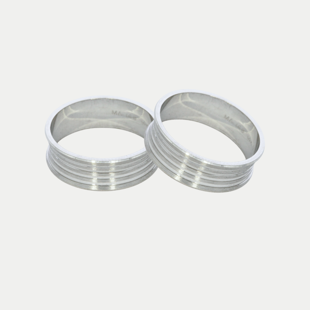 Hechas en oro blanco con tallado lineal brillante, el cuerpo del anillo es recto por la parte de adentro y por fuera tiene una curvatura hacia adentro, realizamos el grabado de nombre y fecha (letras y números) por la parte de adentro sin costo adicional. Ancho del anillo: 6mm Precio aplica para par con medidas 6.0 y 10.0. Mandar mensaje por WhatsApp para cotizar en diferentes medidas (tiene un costo extra cuando sumando las medidas de los dos anillos da un total de 16 puntos en adelante). Tiempo de preparación de los anillos: 20 días hábiles aproximadamente, mas el tiempo...