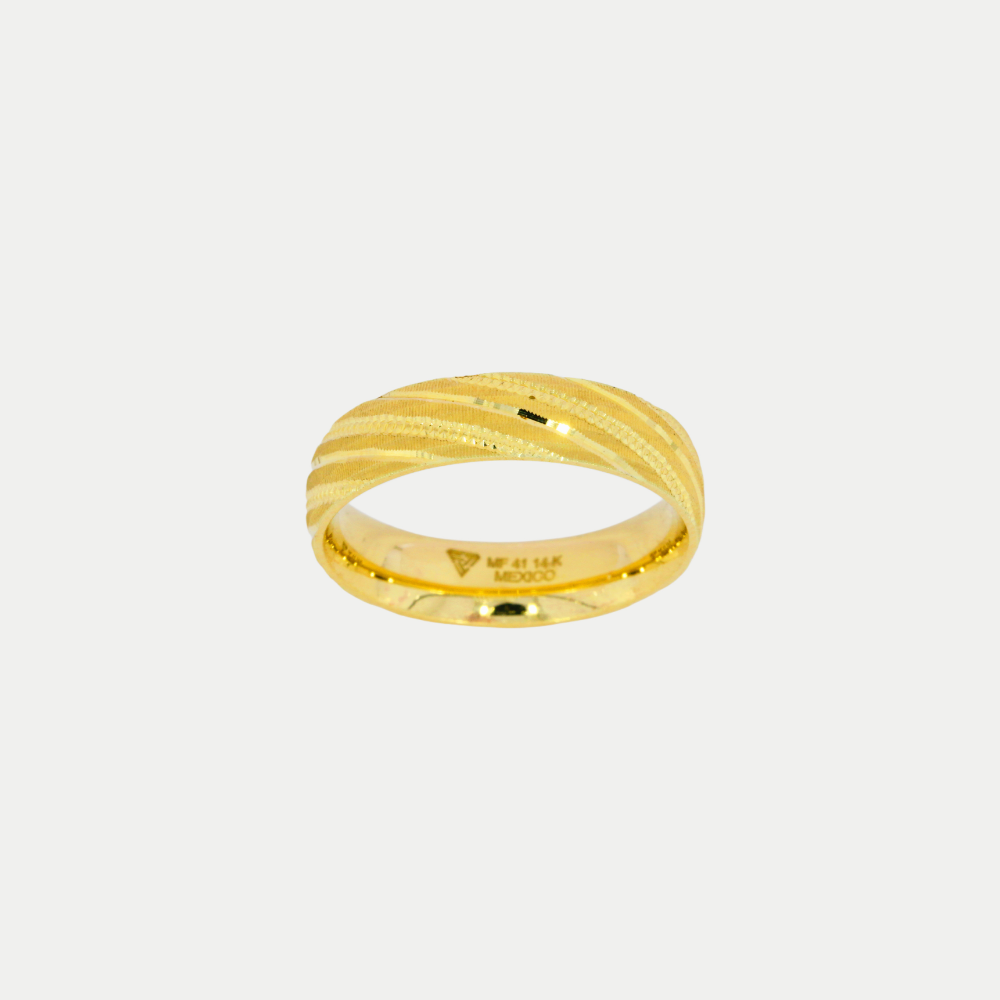 Hechas en oro amarillo, acabado satinado con líneas en diagonal al rededor del anillo, realizamos el grabado de nombre y fecha (letras y números) por la parte de adentro sin costo adicional. Ancho del anillo: 5mm Precio aplica para el par con medidas 6.0 y 10.0. Mandar mensaje por WhatsApp para cotizar en diferentes medidas (tiene un costo extra cuando sumando las medidas de los dos anillos da un total de 16 puntos en adelante). Tiempo de preparación de los anillos: 30 días hábiles aproximadamente, mas el tiempo de entrega de paquetería que es de 2 - 5 días hábiles aproximadamente.