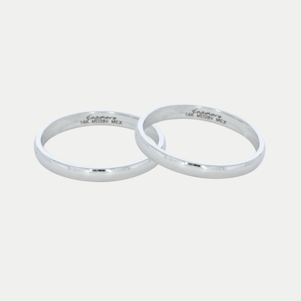 Hechas en oro blanco acabado pulido, modelo sólido, realizamos el grabado de nombre y fecha (letras y números) por la parte de adentro sin costo adicional. Ancho del anillo: 2.5mm Precio aplica para el par con medidas 6.0 y 10.0. Mandar mensaje por WhatsApp para cotizar en diferentes medidas (tiene un costo extra cuando sumando las medidas de los dos anillos da un total de 16 puntos en adelante). Tiempo de preparación de los anillos: 20 días hábiles aproximadamente, mas el tiempo de entrega de paquetería que es de 2 - 5 días hábiles aproximadamente.