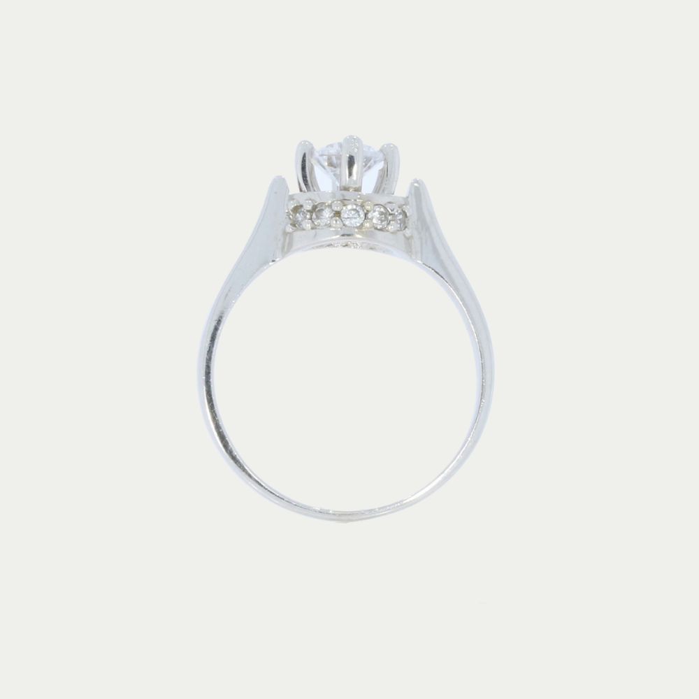 Anillo con una zirconia en la parte central, y pequeñas a un costado de la montura, costados del anillo lisos. Medida: 6.0 Peso: 3.0 SKU: 0616-2SOLI-3.0-Mabel